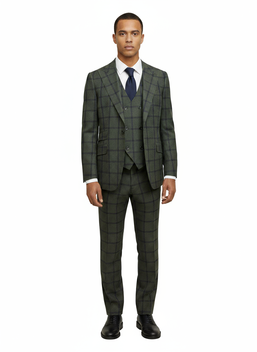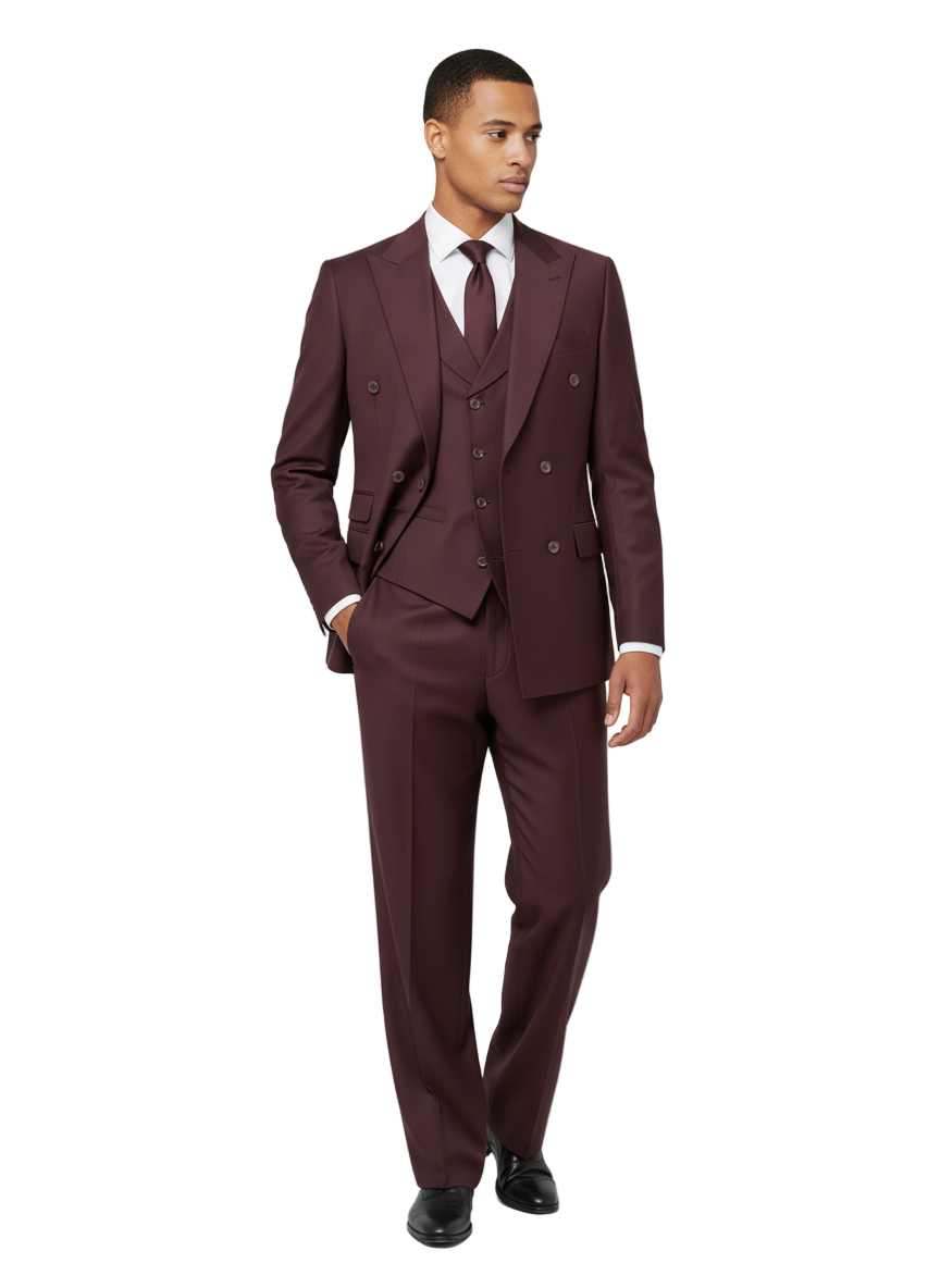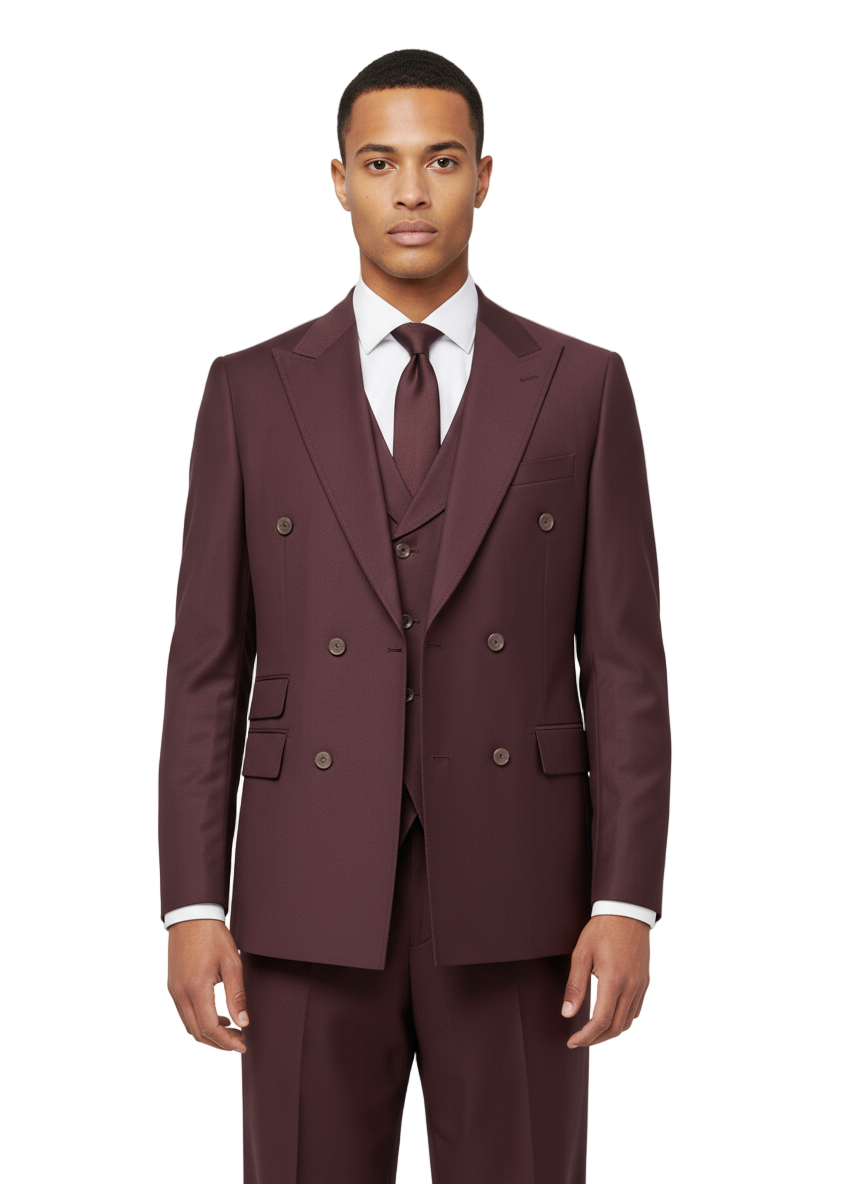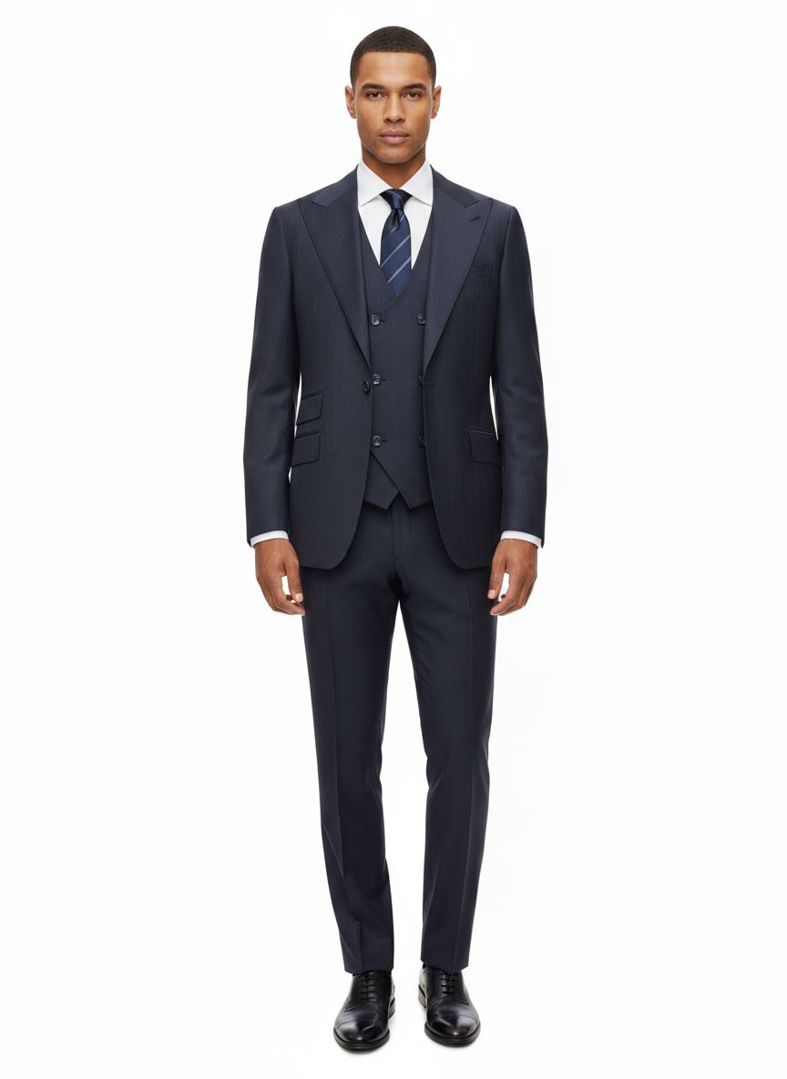 - Double breasted, pure wool, peak lapel, hand stitched lining, side vents