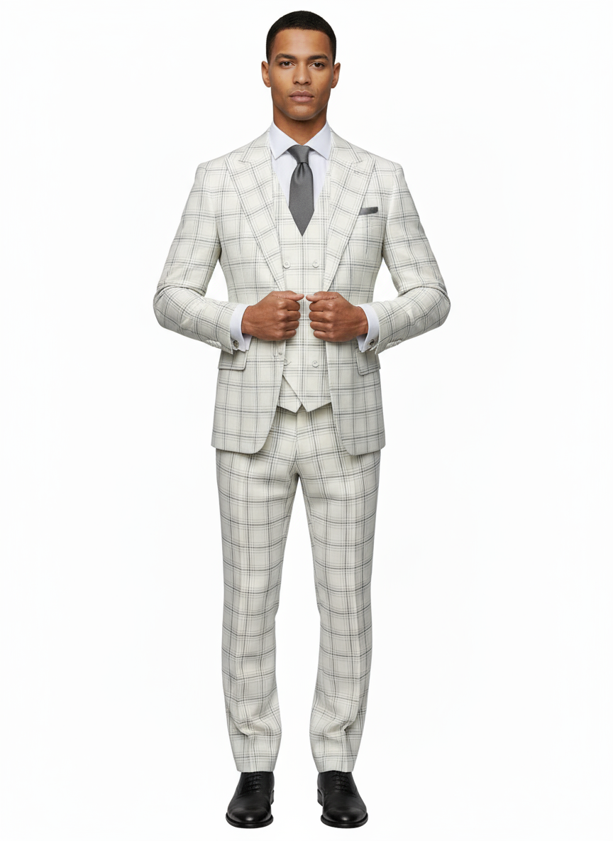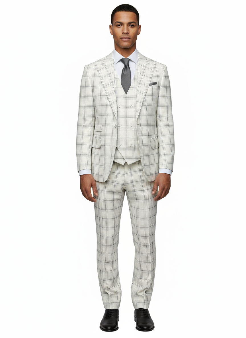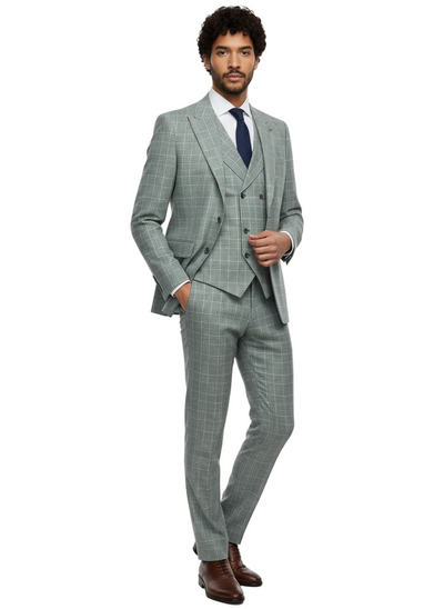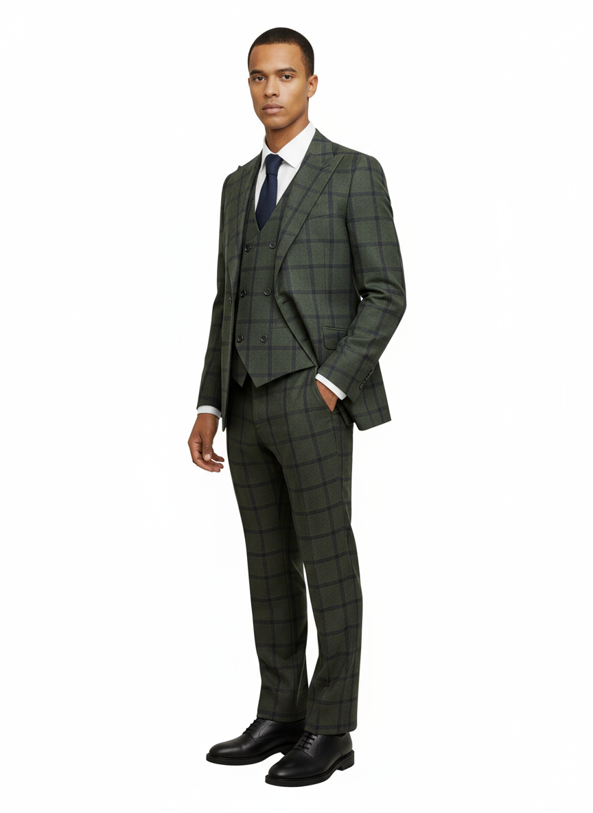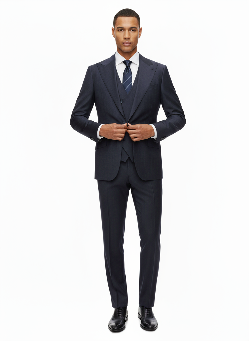 - Double breasted, pure wool, peak lapel, hand stitched lining, side vents