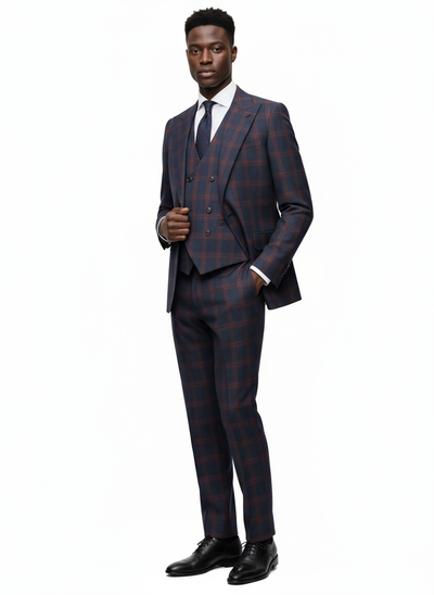 Navy with Red Windowpane Orvietto Semi Wide Leg Pure Wool Suit & Vest Compose by Tiglio Rosso